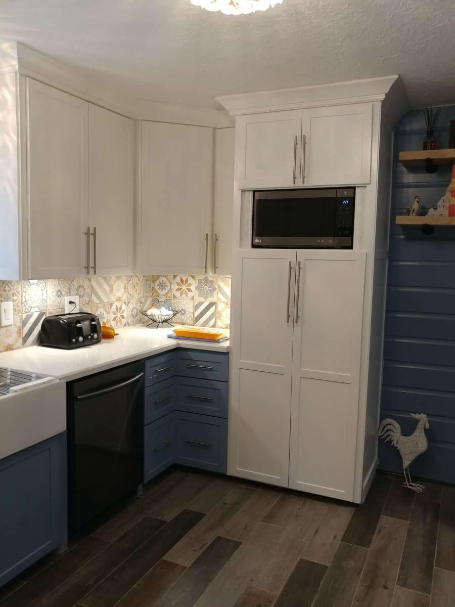 The choice for the color of the lower cabinets was made easy after we chose our tile and blue it was for my lower cabinets. I used Sherwin Williams “Bohemian Lace” for my white color on the upper cabinets and Sherwin Williams “Bracing Blue” for my lower cabinets.