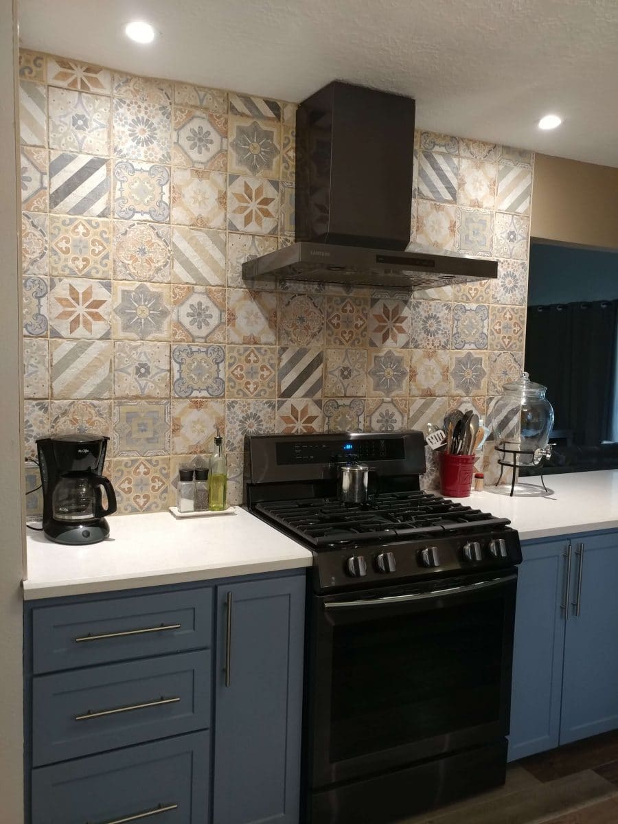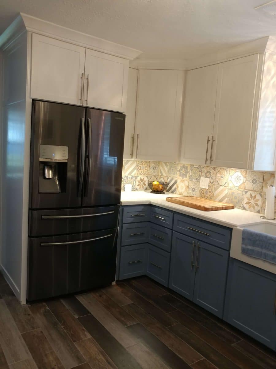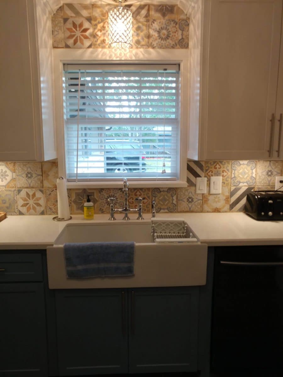 The choice for the color of the lower cabinets was made easy after we chose our tile and blue it was for my lower cabinets. I used Sherwin Williams “Bohemian Lace” for my white color on the upper cabinets and Sherwin Williams “Bracing Blue” for my lower cabinets.